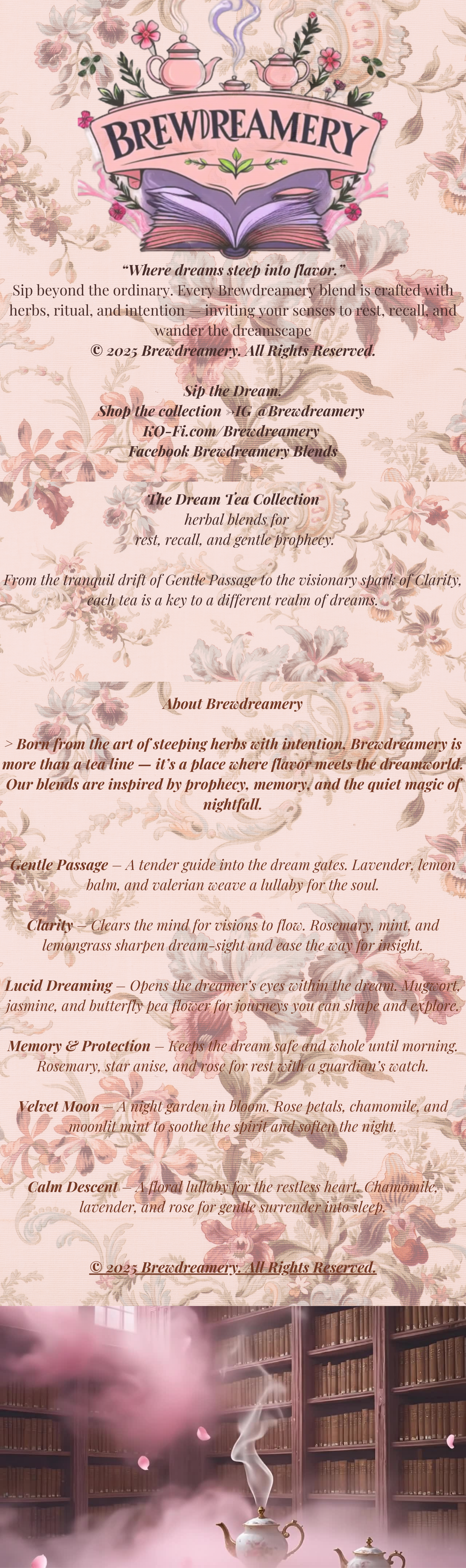Discover Brewdreamery’s Dream Tea Collection — artisanal herbal blends crafted for rest, dream recall, lucid exploration, and gentle night-time protection.